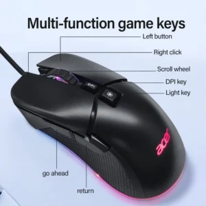 ماوس گیمینگ باسیم ایسر مدل 0MW13O با حسگر اپتیکال، دارای 7 کلید، نورپردازی RGB با قابلیت تغییر افکت نوری، رابط USB، دقت 7200 DPI