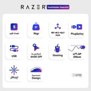 ماوس گیمینگ باسیم ریزر مدل DeathAdder Essential با حسگر اپتیکال، دارای 5 کلید با قابلیت برنامهریزی، طراحی ارگونومیک و نورپردازی، رابط USB، دقت 6400 DPI
